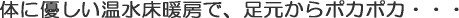 人の体に一番優しいと言われている暖房器具がこの温水床暖房です!女性に多い冷え性の方々はいくらエアコンやファンヒーターでお部屋を温めても頭がボ〜とするだけで体の末端部分の手足が冷たいままなんて事がありますよね。床暖房の輻射熱は足元からじんわりと体を温めていきますので、冷え性の方々にはうってつけです。特に高齢者の方や小さなお子様のいらっっしゃるご家庭には危険がなく、空気も汚さないのでこの床暖房を導入されるご家庭が増えてきています。またお店の暖房器具として設備を検討されるサロン様も増えてまいりました。 |